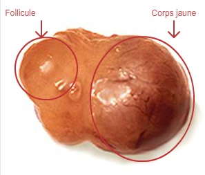 Le corps jaune (corpus luteum) produit l’hormone de la gestation (progestérone). Cette hormone conduit, via la circulation sanguine, à des modifications dans le comportement et au niveau de l’appareil génital. On appelle aussi le jeune corps jaune corpus haemorrhagicum. Celui-ci est mou et de couleur rouge. D’un corps jaune mûr au milieu du cycle, on dit aussi qu’il est en fleur. Il est souvent en forme de bouchon de champagne. Il devrait atteindre une part d’au moins 50% de l’ovaire.