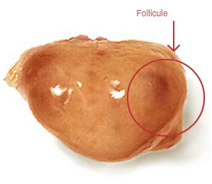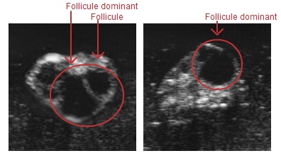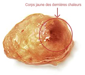 Durant les chaleurs, le follicule atteint sa taille maximale en peu de temps. Son diamètre atteint 1.5 à 2 cm. Il y a un liquide qui entoure l’ovule dans le follicule. Il est tout à fait possible que le corps jaune (corpus luteum) du cycle précédent soit encore présent. Il peut se trouver sur le même ovaire que le follicule ou sur l’autre.