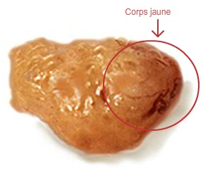 Le corps jaune (corpus luteum) produit l’hormone de la gestation (progestérone). Cette hormone conduit, via la circulation sanguine, à des modifications dans le comportement et au niveau de l’appareil génital. On appelle aussi le jeune corps jaune corpus haemorrhagicum. Celui-ci est mou et de couleur rouge. D’un corps jaune mûr au milieu du cycle, on dit aussi qu’il est en fleur. Il est souvent en forme de bouchon de champagne. Il devrait atteindre une part d’au moins 50% de l’ovaire.
